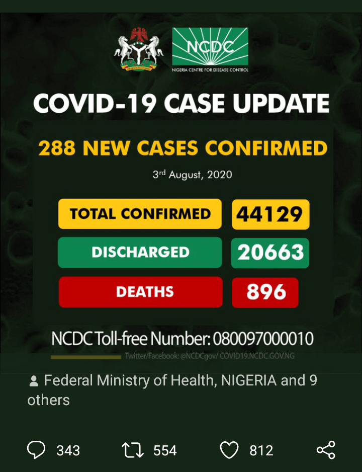 In a pleasant turn of events, new cases of Covid-19 have continued to decrease with 288 cases reported by NCDC. In previous weeks, the figures had ranged from 500 to 700. So far, 44129 cases have been confirmed, 20663 have been discharged while 896 cases of death occurred. Lagos has 88, Kwara 33,Osun 27 and… Continue reading Further Decline in Covid-19 Cases as NCDC Reports 288 New Cases_Ada Nkong