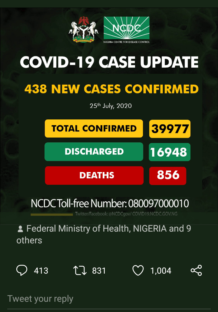 In what can be considered a relief, 438 cases of Covid-19 have been reported in Nigeria. A reduction from the 600 vicinity reported often in recent times. With this ,Nigeria is just 23 cases shy of the 40,000 mark. 16948 patients have been discharged while 856 deaths have been reported.