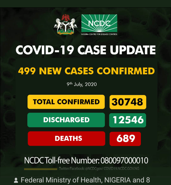 499 Fresh cases of Covid-19 have been reported in Nigeria. That brings the total number confirmed so far to 30748. 12546 patients have been discharged while 689 deaths were recorded. Lagos has the highest with 157, Edo is next with 59 followed by On do with 56 cases.Abia, Ekiti,Niger,Yobe have just one case each.