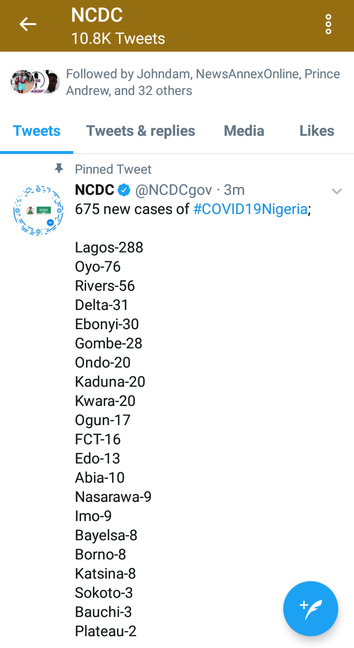 The NCDC has announced 675 more Covid-19 cases in Nigeria. This brings the total number confirmed so far to 20919 out of which 7109 have been discharged and 525 died. Lagos state accounts for 288 of these cases,Oyo76, Rivers 56, Delta 31, Ebonyi 30, Gombe 28, Ondo 20. Sokoto and Bauchi have 3 cases each… Continue reading 675 New Covid-19 Cases Recorded in Nigeria_Ada Nkong