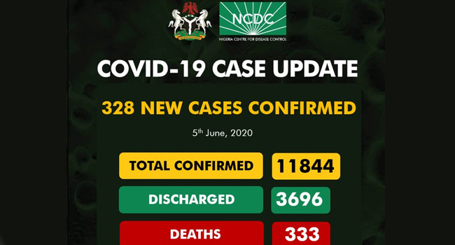 Nigeria has recorded 328 new cases of the COVID-19, bringing the total number of infections in the country to 11, 844. The Nigeria Center for Disease Control (NCDC), announced this on Friday. According to the agency’s report, 121 of the new cases were recorded in Lagos, 70 in the FCT, and 25 in Bauchi. Other… Continue reading Covid-19: Update for 5th June 2020-NCDC