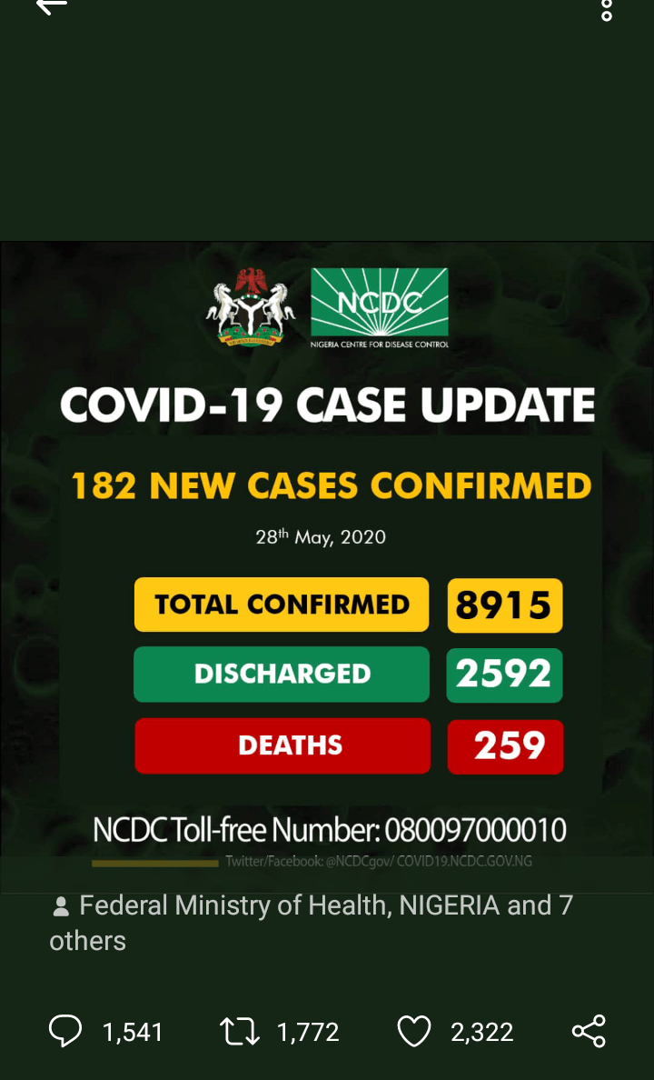 182 new cases of Covid-19 have been reported by the NCDC . 111 of the cases are in Lagos, 16 in FCT , Akwa ibom 10,Oyo 8, Kaduna and Delta 6 cases each.Rivers has 5, Ogun and Ebonyi 4, Kano 3 while Plateau and Gombe have 2 each. Kebbi, Kwara, Bauchi and Borno have one… Continue reading 182 More Covid-19 Cases Reported in Nigeria_Ada Nkong