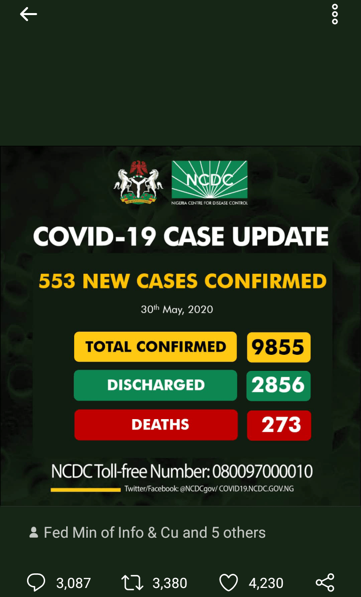 553 new cases of #COVID19; Lagos-378FCT-52Delta-23Edo-22Rivers-14Ogun-13Kaduna-12Kano-9Borno-7Katsina-6Jigawa-5Oyo-5Yobe-3Plateau-3Osun-1 9855 cases of #COVID19NigeriaDischarged: 2856Deaths: 273