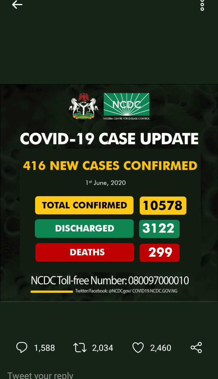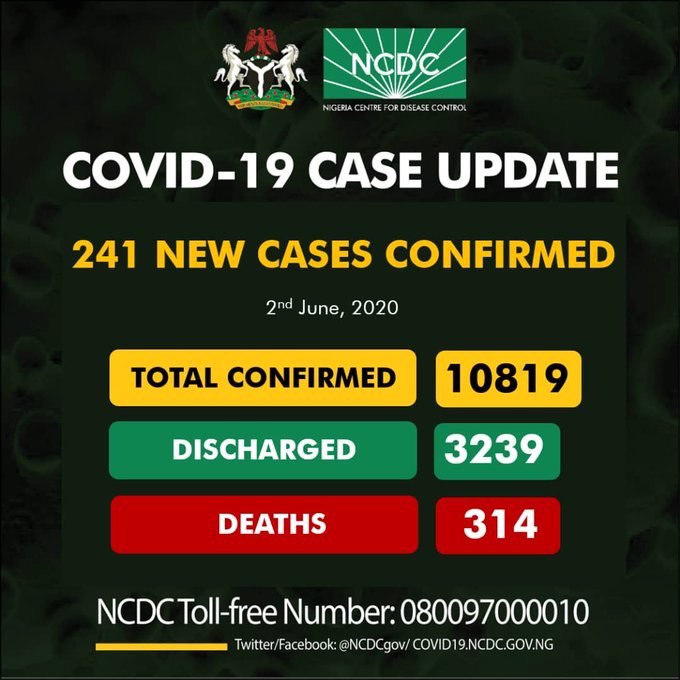 241 new cases of #COVID19: Lagos-142Oyo-15FCT-13Kano-12Edo-11Delta-10Kaduna -9Rivers-9Borno-8Jigawa-4Gombe-3Plateau-3Osun-1Bauchi-1 As at 2nd of June 2020, there are 10819 cases of #COVID19 in Nigeria, 3239 discharged and 314 dead. A breakdown of cases by State is as shown here: