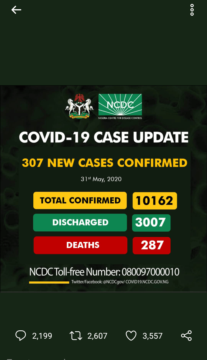 307 new cases of Covid-19 were confirmed by the NCDC on the 31 st May 2020. With this the total number of confirmed cases so far in Nigeria is 10162. 3007 persons have been discharged while 287 persons have died making the number of active cases to be 6868.