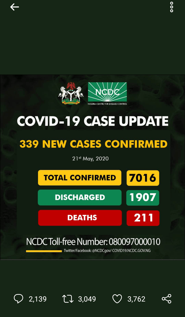 The NCDC has confirmed 339 more cases of Covid-19 in Nigeria. This brings the total number of confirmed cases to 7016. Lagos has the highest with 139 cases.while Rivers and Adamawa have just one case. 1907 patients have been discharged so far with 211 deaths recorded.