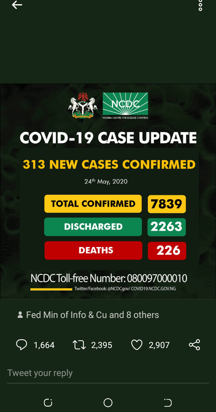 The NCDC has announced 313 fresh confirmed cases of Covid-19. This brings the total number of cases confirmed so far to 7839. 2263 patients have been discharged so far while 226 have died. Lagos tops the list with 148 cases, Abuja is next with 36,Rivers has 27 and Edo has 19. Anambra has just one… Continue reading Covid-19 :313 New Cases Reported by NCDC_Ada Nkong