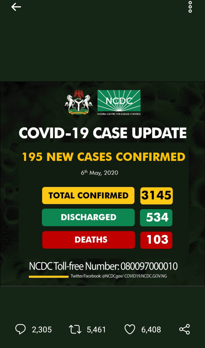 195 more cases of Covid-19 have been confirmed by the NCDC. That brings the total number of confirmed cases to 3145. 82 of the cases are in Lagos, 30 in Kano, Zamfara 19, Sokoto 18, Borno 10, FCT 9,Oyo 8, Kebbi and Gombe 5, Ogun 4, Katsina 3 while Kaduna and Adamawa have 1 each.… Continue reading Covid-19: Nigeria Crosses 3000 Mark With 195 New Cases_Ada Nkong
