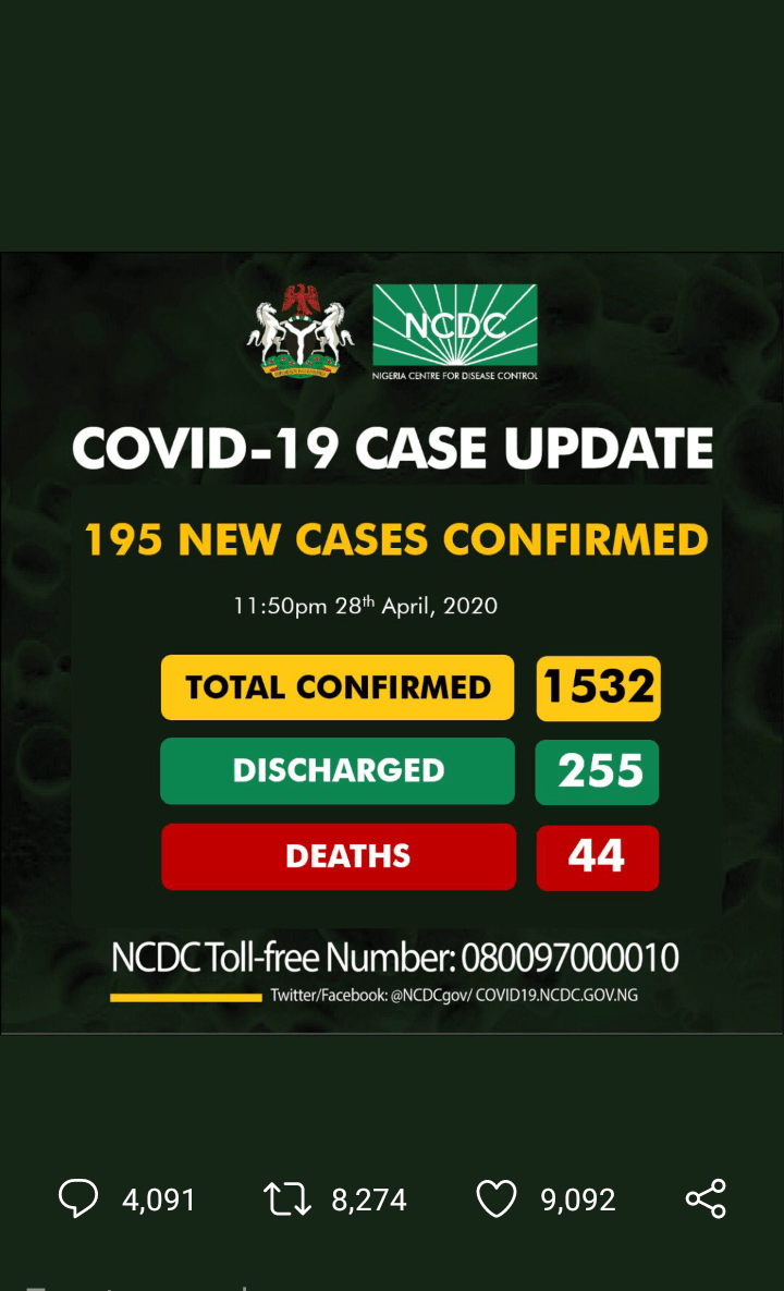 The NCDC has reported 195 fresh cases of Covid-19 in Nigeria. This follows an increased capacity to test as reported by the center. Of the 195 cases, Lagos has 80, Kano 38, Ogun and Bauchi 15 each, Borno11, Gombe 10 ,Sokoto 9, Edo and Jigawa 5, Zamfara 2 , Rivers, Enugu and Delta 1 each.… Continue reading 195 New Cases of Covid-19 Reported in Nigeria_Ada Nkong