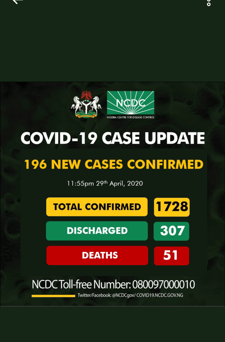 As at Midnight 29 April 2020, the number of Deaths from the Coronavirus Pandemic in Nigeria rose to 51 with 196 new cases confirmed. This brought the total number of confirmed cases to 1728. On a brighter note, 307 persons had been discharged nationwide leaving the number of active cases at 1370.