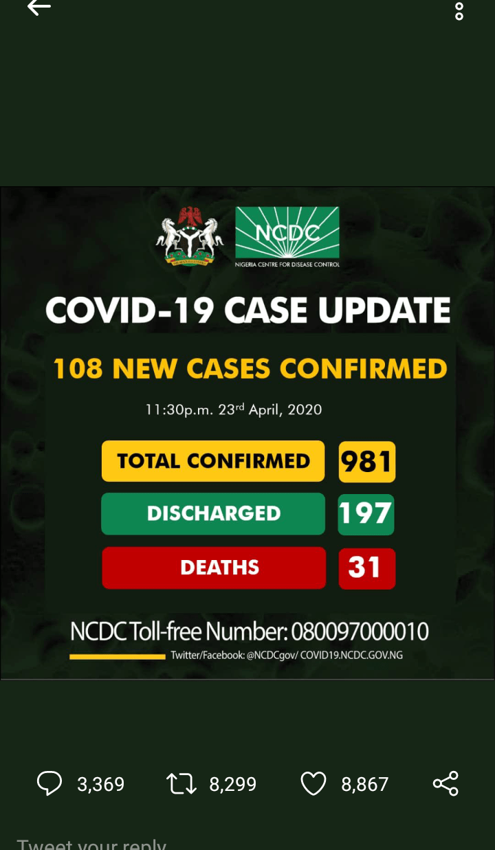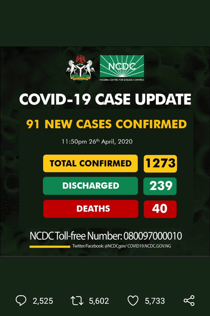 91 fresh cases of Covid-19 have been reported in Nigeria. Lagos has the greatest number of cases 43,Sokoto 8,Taraba 6,Kaduna and Gomve 5 cases eachOndo,FCT,Edo,Rivers and Oyo as well as Bauchi 3 cases, Osun 2 cases Akwa Ibom 1 case . The number of discharged cases is 239 while the number of deaths has risen… Continue reading 91 New Cases of Covid-19 Reported in Nigeria, Toll Rises to 1239 _Ada Nkong