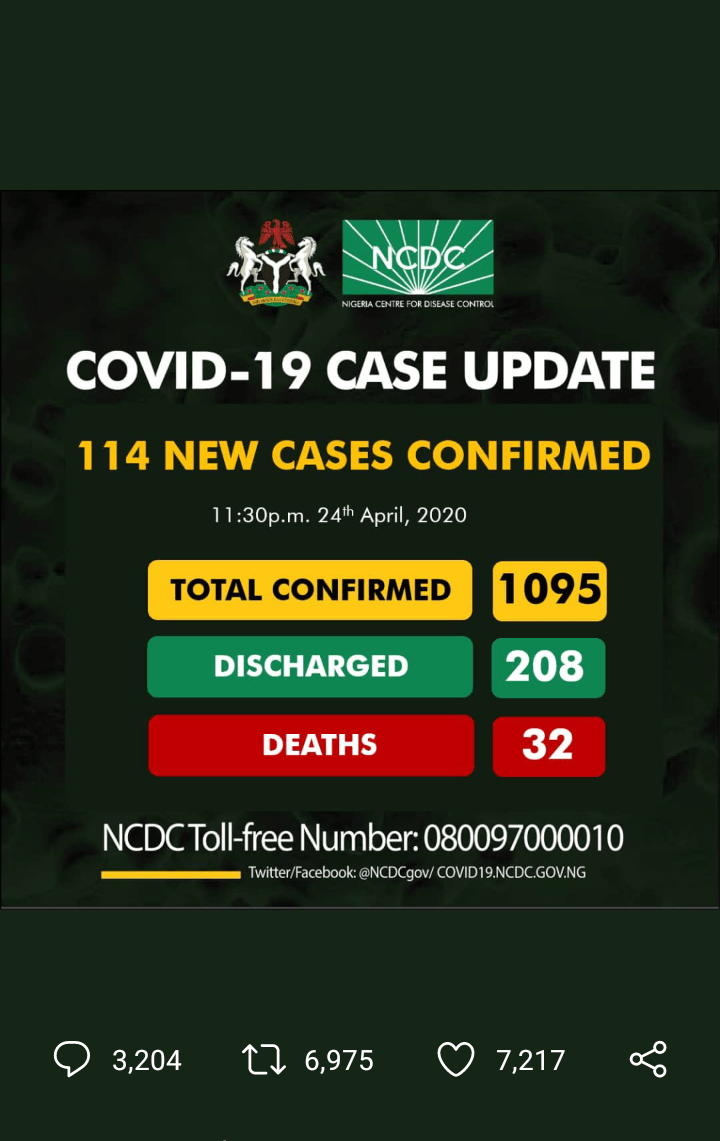 The NCDC has announced additional 114 cases in Nigeria bringing the total number of confirmed cases to 1095. Of these, 208 have been discharged and 32 died. This leaves the number of active cases at 855. The 114 cases are .80 in Lagos, 21 in Gombe, 5 in FCT, 2 in Zamfara, 2 in Edo,… Continue reading Covid-19: Nigeria Exceeds 1000 Cases_ Ada Nkong