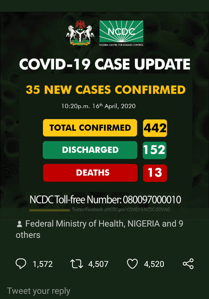 The NCDC has reported 35 new cases of Covid-19 in Nigeria. Of the 35 cases, 19 are in Lagos, 9 in the FCT, 5 in Kano and 2 in Oyo. That brings the total number of cases confirmed in Nigeria to 442. Out of these 152 have been discharged while 13 deaths have been recorded.