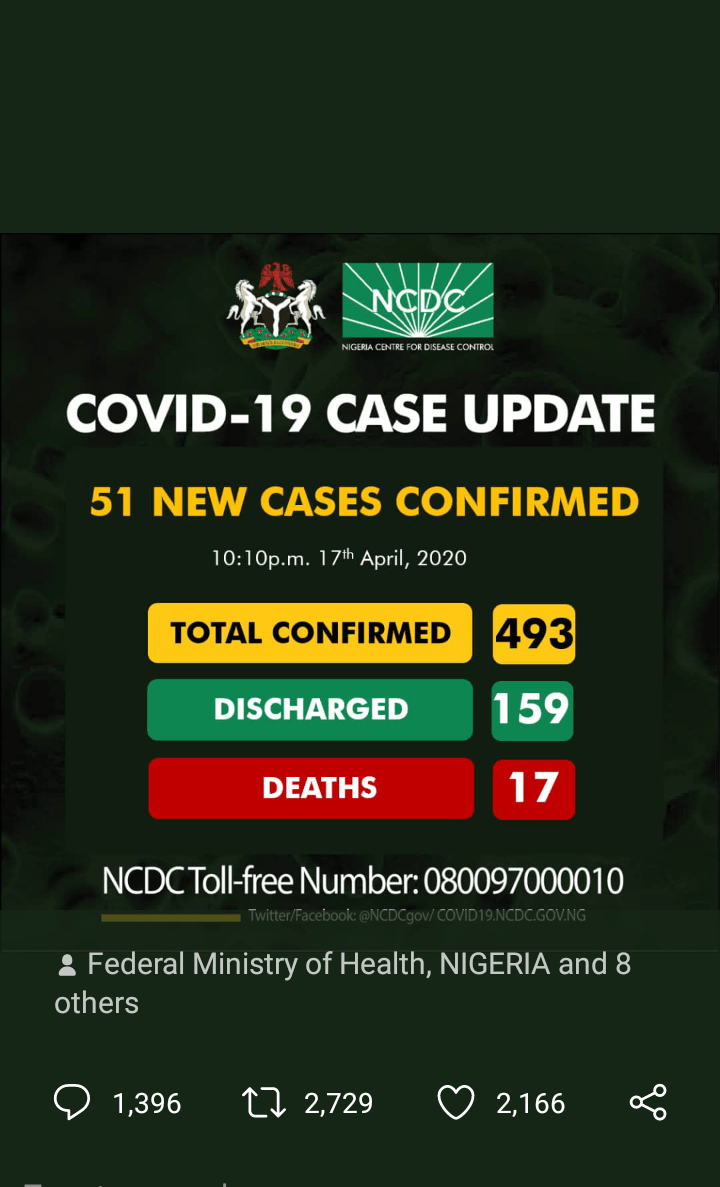 In what is the highest figure reported so far, 51 cases of Covid-19 have been reported by the NCDC. Of the 51, Lagos has the highest with 32, 6 in Kano, 5 in Kwara, 2/in FCt, 2in Oyo and Katsina and 1/each in Ogun and Ekiti. The total number of confirmed cases is 493 with… Continue reading 51 Cases of Covid-19 Reported in Nigeria_Ada Nkong