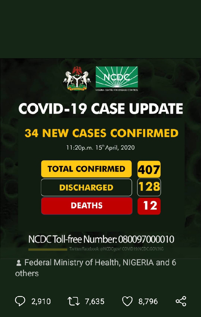 The NCDC Wednesday night announced 34 new cases of Covid-19 in Nigeria. That brings the number of cases confirmed so far to 407. Discharged cases have risen to 128 while.number of deaths stand at 12.