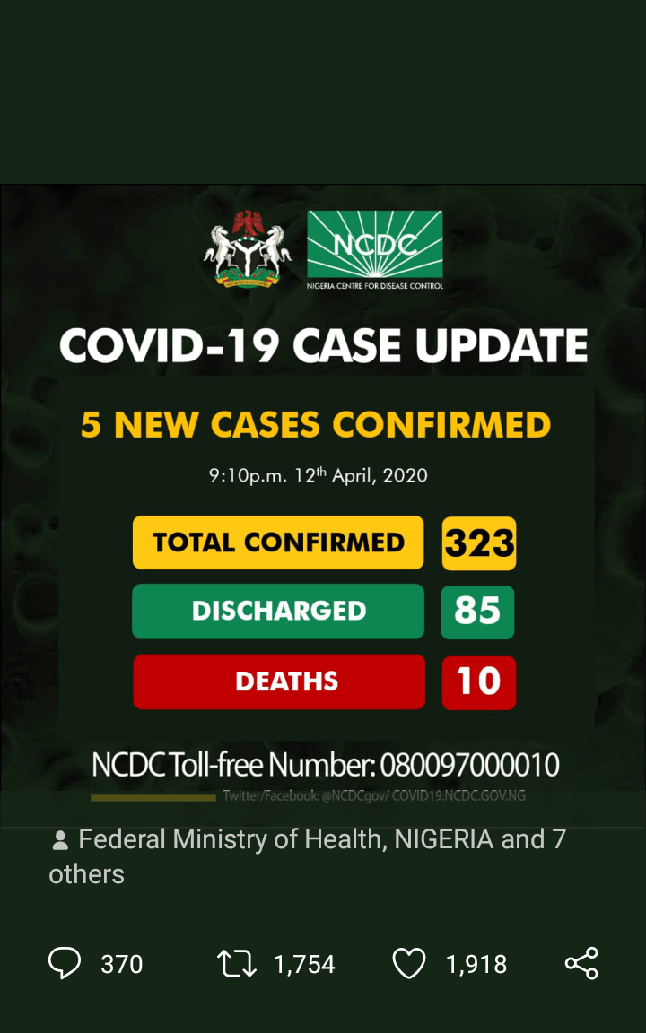 Five new Covid-19 cases have been reported in Nigeria bringing the overall total to 323. According to NCDC's post on its official Twitter handle,two of the cases are in Lagos .2 in Kwara and 1 in Katsina. The total number of discharged cases has risen to 85 with ten deaths. The President says, the lockdown… Continue reading Five New Covid-19 Cases in Nigeria_Ada Nkong