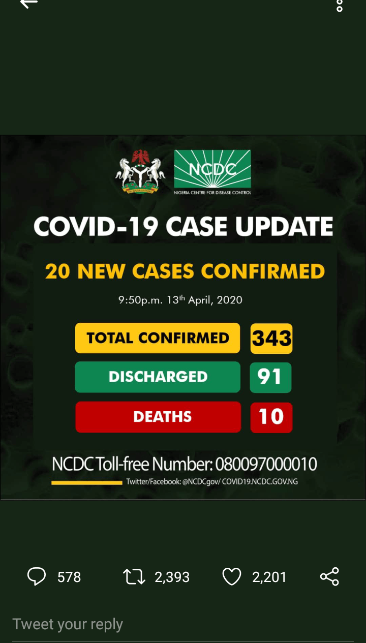 The NCDC has reported 20 new cases of Covid-19 in Nigeria. Lagos has 13 cases, 2 in Edo,Kano and Ogun and 1 in On do. Discharged patients remain at 91 while deaths stand at ten.