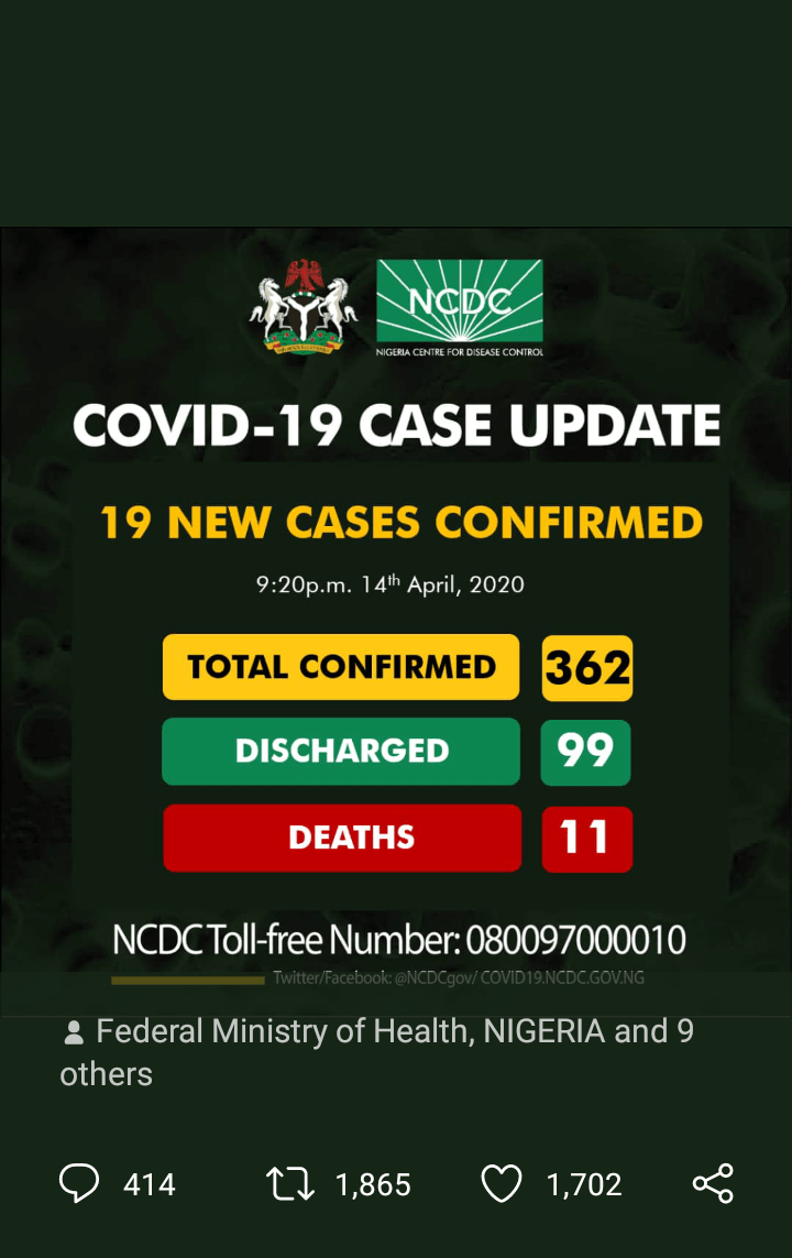 Eleven new cases of #COVID19 have been reported in Lagos State. As at 11:00 pm 14th April there are 373 confirmed cases of #COVID19 reported in Nigeria. 99 have been discharged with 11 deaths NCDC