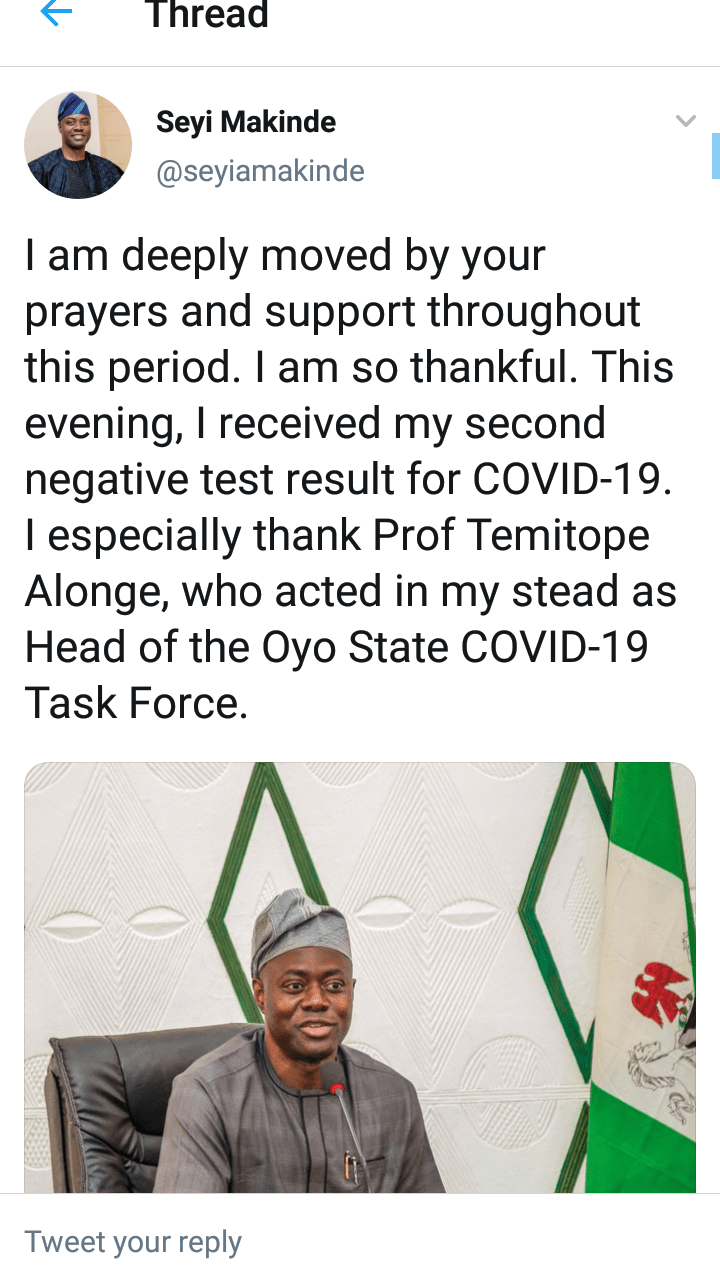 Governor Seyi Makinde of Oyo State says hehas tested negative for the Coronavirus.The Governor said this on his official twitter handle six days after he tested positive for the COVID-19. Newsannexonline recalls that the governor had taken to social media on March 30th, to announce that he had tested positive for the virus, stating that… Continue reading Seyi Makinde Recovers From Covid-19 _Ada Nkong