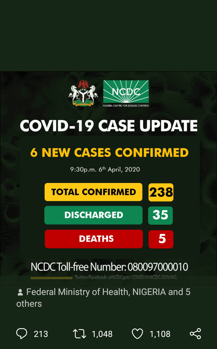 The NCDC has reported 6 new cases of Covid-19 in Nigeria. This brings the total number of confirmed cases to 238. Of the 6 cases, 2_are in Kwara State, 2 in Edo state, 1 in Rivers state and 1 in the FCT. So far, 35 patients have been discharged while 5 died