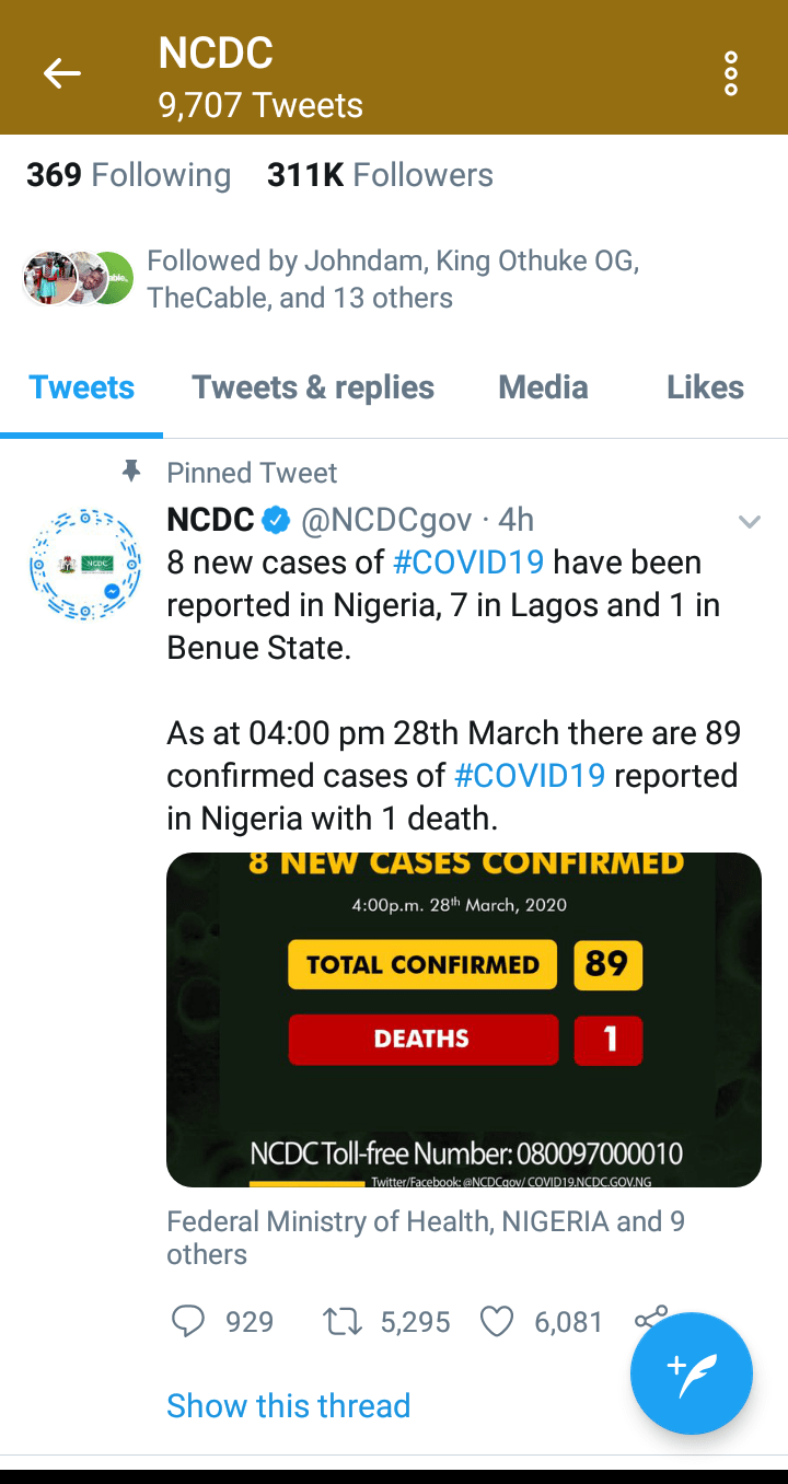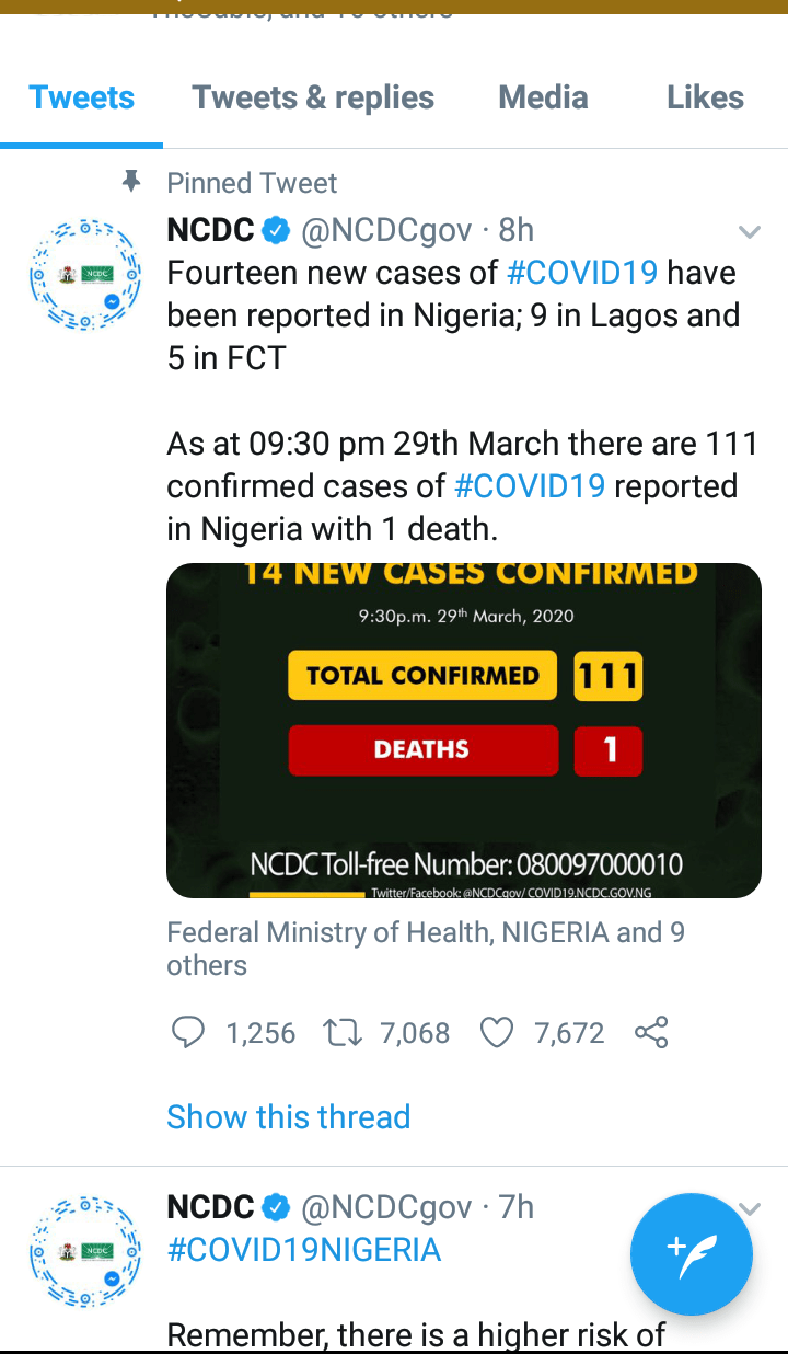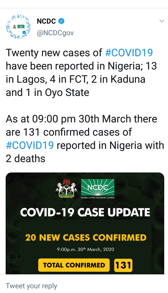 The total number of confirmed cases of Covid-19 in Nigeria has risen to 131. The NCDC announced on its Twitter handle that 13 new cases have been reported in Lagos, 4 in FCT,2 in Kaduna and 1 in Oyo. This comes on the same day a second death was reported in Nigeria and five patients… Continue reading Twenty New Covid-19 Cases Reported in Nigeria_Ada Nkong