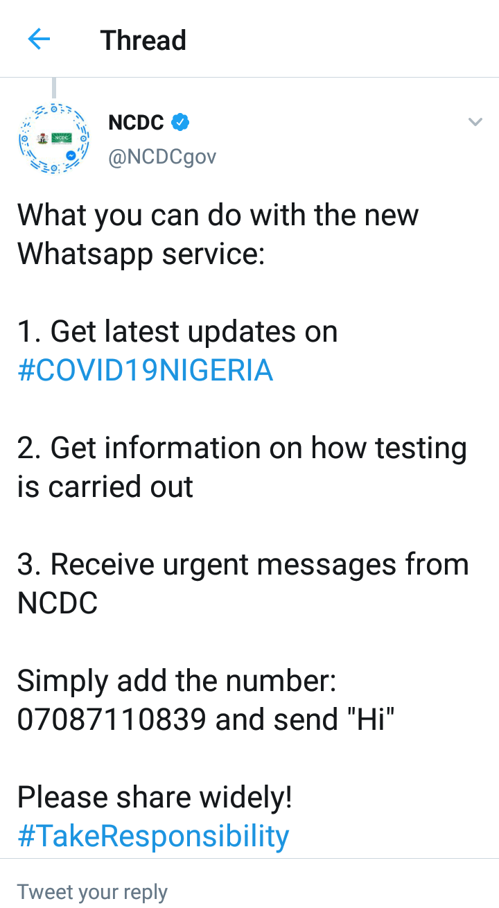 The Nigeria Centre for Disease Control (NCDC) has introduced a WhatsApp service to enable it better communicate to Nigerians,how to curtail the spread of coronavirus (COVID-19) in the country.In a tweet on Sunday, the center explained that the newly launched platform is to make room for a two-way real time communication on WhatsApp, between the… Continue reading NCDC Unveils WhatsApp Platform for Real Time Communication_Ada Nkong