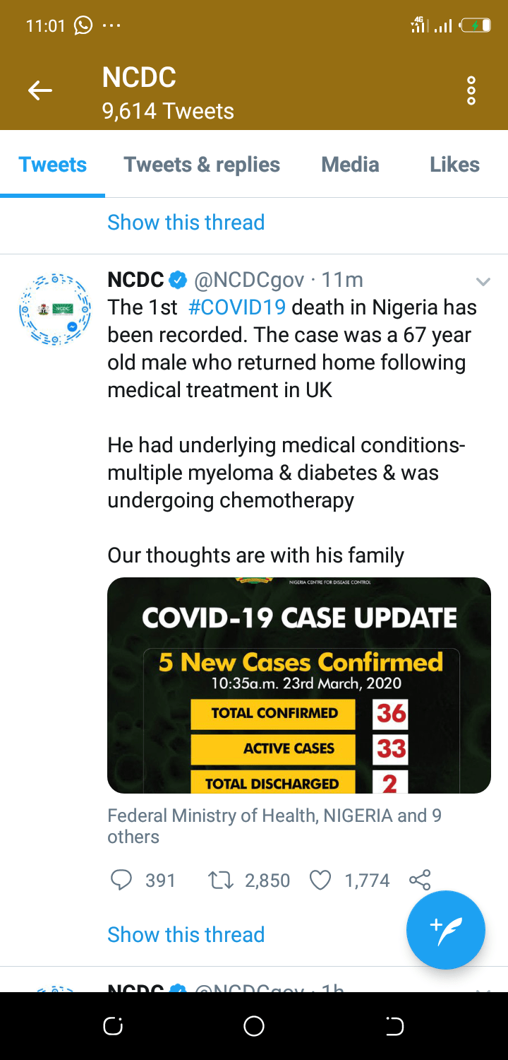 The NCDC has reported the death of a 67 old male from Covid-19 in Nigeria. A tweet on its official twitter handle says the patient had underlying causes and had just returned from medical treatment in the UK. The Identity of the patient was not disclosed. This is the first death due to Covid-19 in… Continue reading Nigeria Records First Death From Covid-19_Ada Nkong.