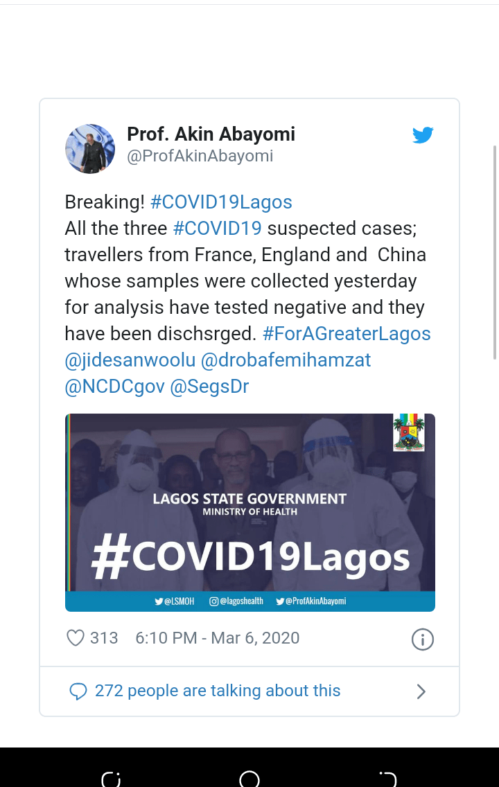 All the three suspected cases of coronavirus have been discharged from the Infectious Disease Hospital in the Yaba area of Lagos state says Lagos State Commissioner of health..Akin Abayomi, commissioner of health in Lagos, took to his Twitter handle on Friday evening to disclose this..He tweeted ,“All the three #COVID19 suspected cases; travellers from France,… Continue reading Lagos State Covid-19 Suspected Cases Test Negative_Ada Nkong