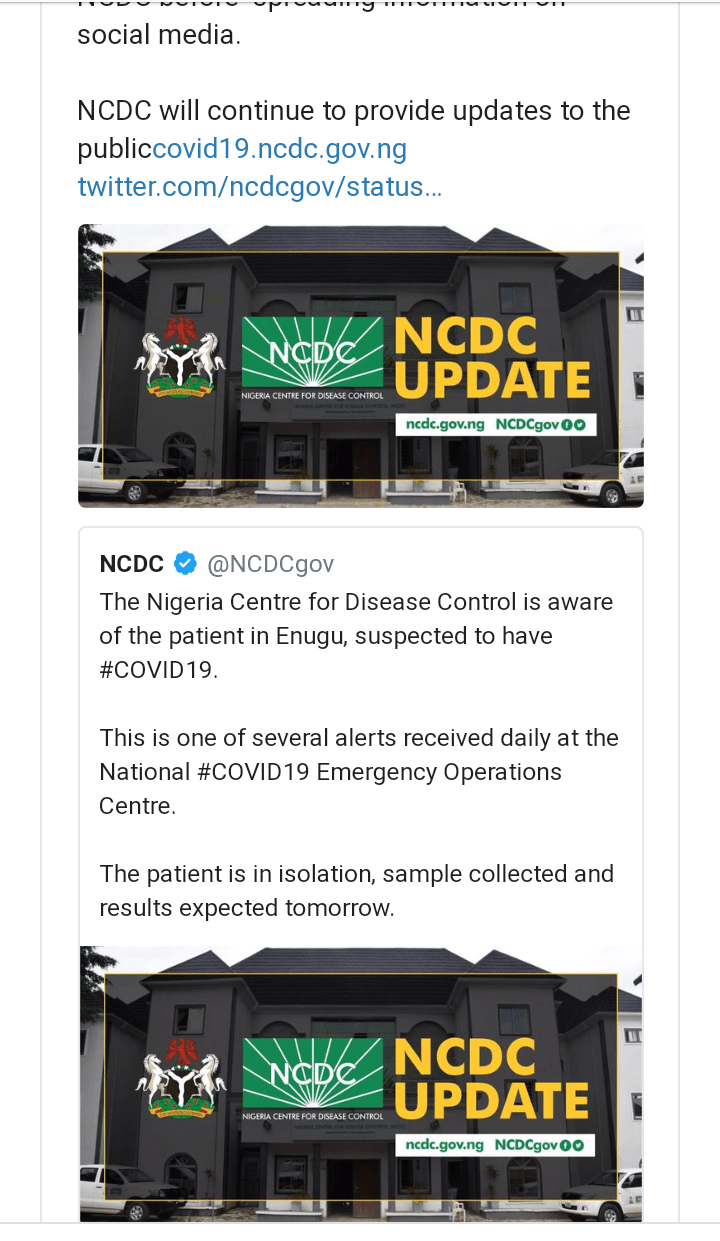 The suspected case of Covid-19 in Enugu has been certified Negative by the National center for disease control. Though the center earlier promised to release the result on Monday, a tweet on its twitter handle on Sunday night, declared him negative and warned Nigerians against spreading information on suspected cases on social media without hearing… Continue reading Enugu Covid-19 Suspected Case Tests Negative_Ada Nkong