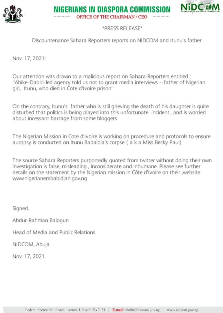 Following a report by Sahara reporters that the Chairman Nigerians in Diaspora commission, Hon. Abike Dabiri-Erewa instructed the father of late Miss Itunu Babalola not to speak to the media, the commission has issued a statement describing the report as false, misleading, inconsiderate and inhumane. See full statement below: PRESS RELEASEDiscountenance Sahara Reporters reports on… Continue reading NIDCOM Distances Self From Sahara Reporters Story About Itunu’s Father Speaking to Media_Ada Nkong