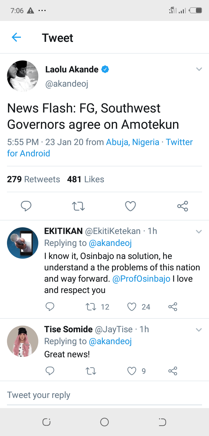 A tweet on Laolu Akande Senior media aide to the Vice President says at a meeting today, an agreement has been reached with Governors from the South west on Amotekun.A statement by Laolu Akande says the meeting held at the instance of the governors who met with the Vice president Prof Osinbanjo because the President… Continue reading Finally FG,SW Govs Agree on Amotekun_Ada Nkong