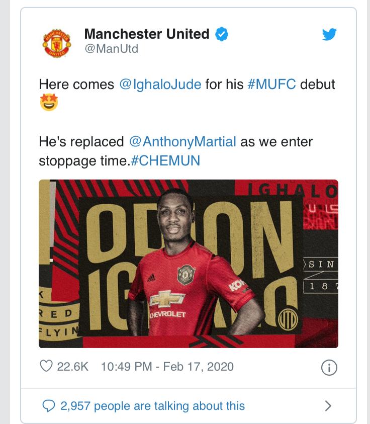 Ighalo makes Manchester United history with debut against ChelseaOdion Ighalo has become the first Nigerian to play for Manchester United following his debut against Chelsea.With Ole Gunnar Solskjaer's men leading 2-0 a Stamford Bridge, Ighalo was introduced as a 90th minute substitute for Anthony Martial.The ex-international made his way back to the Premier League, having… Continue reading Ighalo Debutes at Man U_Erik Ogar