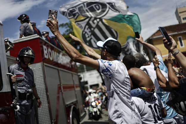 Pele's coffin, draped in the Brazilian flag, leaves Santos' stadium on a fire engine to begin the procession as thousands of mourners line the streets.