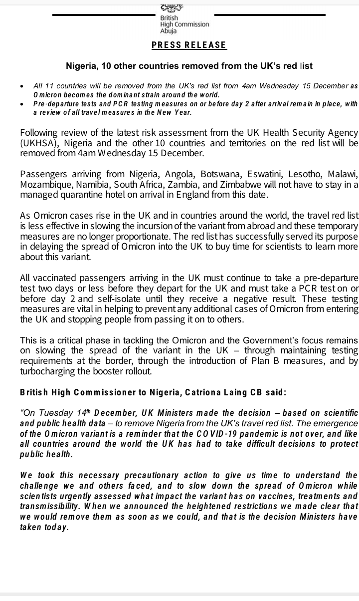 The UK government says it has removed Nigeria and 10 other countries from it's travel ban list. A release from the British high commissioner in Nigeria says the ban was lifted after considering medical data. Angola, Lesotho, Eswatini, Malawi, Zambia, Namibia and South Africa are among the countries whose bans were lifted. The statement cited… Continue reading UK Removes Nigeria, 10 Other Countries From Travel Ban List_Ada Nkong