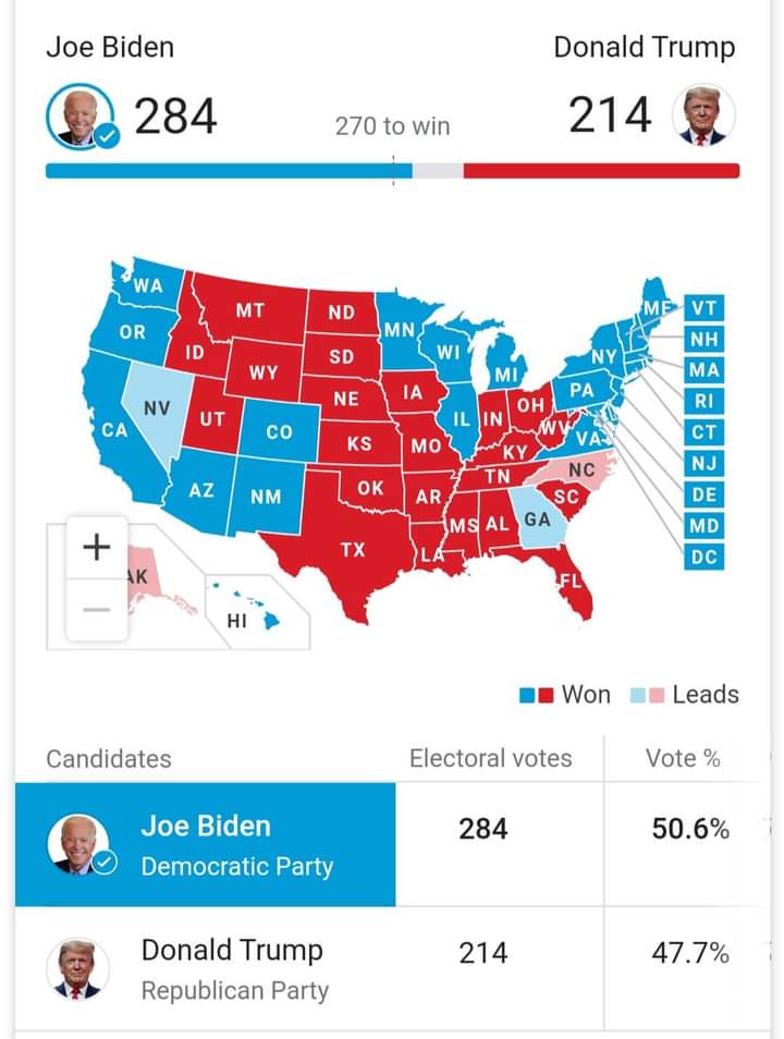 Democrat Joe Biden won the US presidential race after he won Georgia and its 16 electoral college votes, US media reported on Friday. Victory in Georgia is a first for Democrats since Bill Clinton did it in 1992. Biden’s victory brings his tally of electoral college votes to 306 in the state-by-state Electoral College that… Continue reading Biden Wins Georgia,Clinches 306 Electoral College Votes_Ada Nkong